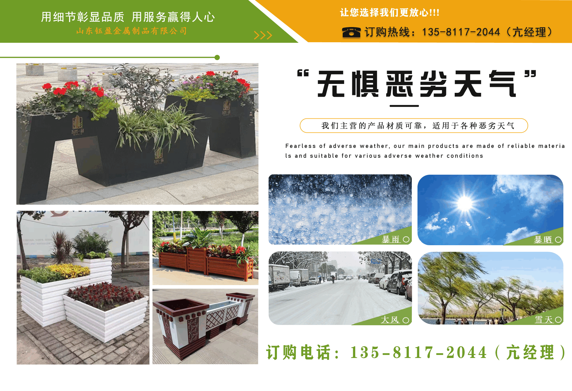 山東鈺盈金屬制品有限公司主營鍍鋅板花箱,道路隔斷花箱,定制花箱,戶外道路花箱,花箱座椅等產(chǎn)品,產(chǎn)品結(jié)構(gòu)合理、性能優(yōu)良,具有強度高、耐腐蝕、抗老化、隔熱隔音、節(jié)約能源、外形美觀、使用壽命長等優(yōu)點,深受國內(nèi)外客戶認可。  我們根據(jù)客戶所在城市的文化特征,制造出符合當(dāng)?shù)爻鞘形幕瘹庀⒌淖匀涣Ⅲw、觀賞性強的花箱產(chǎn)品成為城市里一道靚麗的風(fēng)景線。  公司實行誠實、公正、守信、價格合理、平等互利。  公司憑借雄厚經(jīng)驗實力,恪守誠信為本的原則,得到了眾多客戶的信賴,并在業(yè)界獲得良好的口碑。建立了穩(wěn)固的合作關(guān)系,隨著業(yè)務(wù)的不斷發(fā)展和壯大,合作伙伴的范圍也在不斷擴大。我們熱情盼望與您的合作,為社會的可持續(xù)發(fā)展獻上一份努力。...